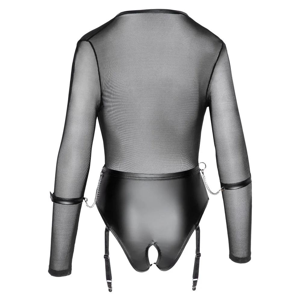 Betoverend lichaam! Zeer laag uitgesneden body van Cottelli BONDAGE met jarretelles. Het bovenste gedeelte van de body met lange mouwen is gemaakt van transparant powernet en het kruisloze slipgedeelte is gemaakt van trendy mat-look materiaal – de perfecte outfit voor spontane seks! De riem is aan het lichaam genaaid en heeft 2 ringen aan de voorkant en een ring aan weerszijden. De meegeleverde handboeien kunnen met karabijnhaken aan de ringen worden bevestigd. De handboeien kunnen worden aangepast met de klittenbandsluitingen. De verstelbare jarretelles kunnen worden verwijderd.