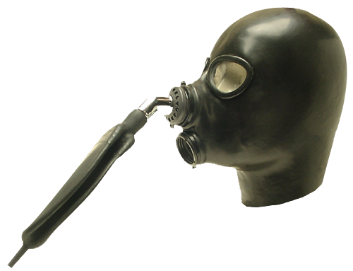 Studio Gum oranje, zwart of semi-transparante Latex Gas Mask Hood GMH2b met in-en uitlaat klep