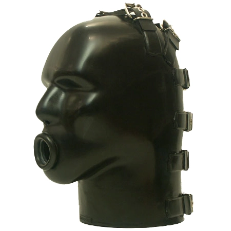 4mm dik rubber masker, gemaak van puur, onbehandeld latex. Met neusgaten en ingebouwde O-ring gag, diameter ca. 35mm. Met 4mm dikke latex haar beschermingsflap.