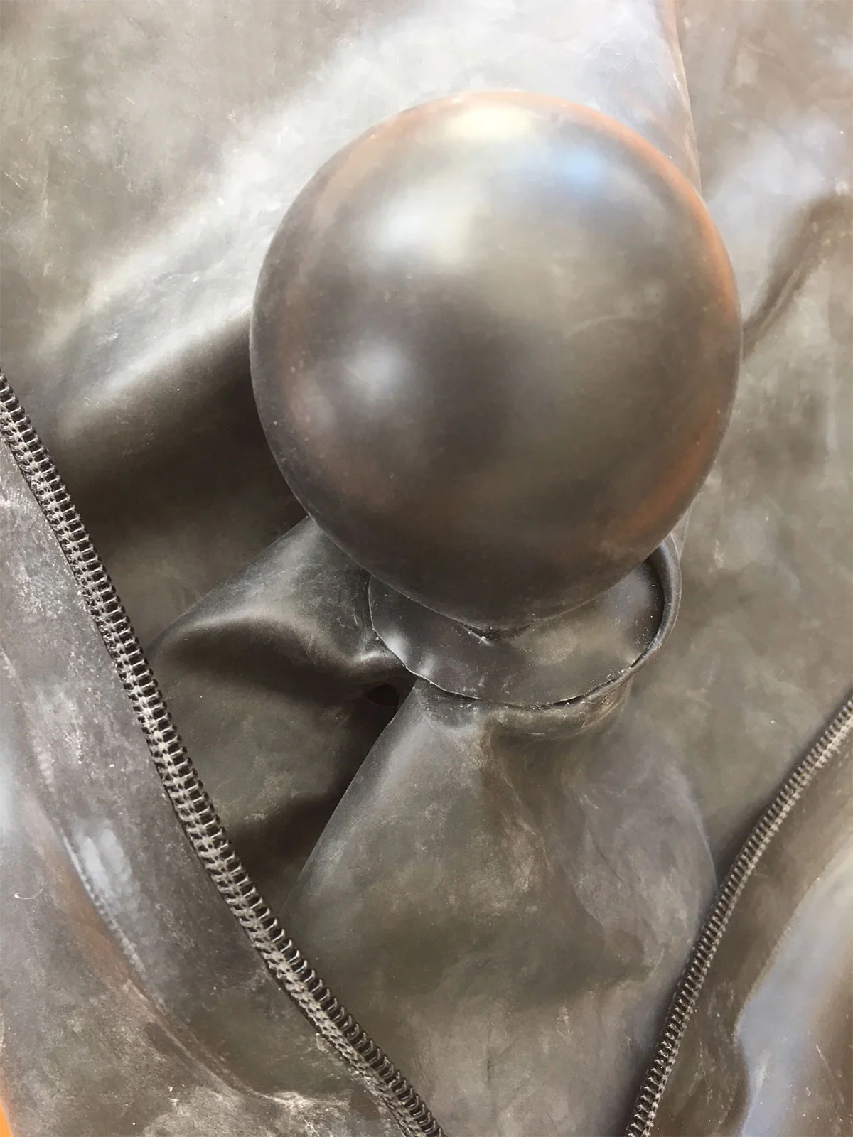 Zwart latex masker met ritssluiting en ingebouwde opblaasbare mondknevel!