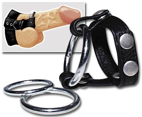 Houd de macht over hem met deze leather strap met metalen studs. Zwart met 3 verschuifbare metaalringen in Ø3, Ø3,5 en Ø4 cm