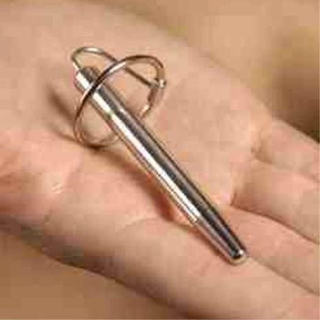 Hoeveel kun je hebben? Tom’s Princes Wand voor de ongepiercde penis – natuurlijk enkel voor uiterst gehoorzame slaven! De basis van dit produkt is een 7,5 cm lange, zorgvuldig gemaakte edelstalen staaf, met konische punt en een doorsnede van 8 mm, welke in de urinebuis geplaatst word. De fixiering is, in tegenstelling tot de conventionele Tom’s Princes Wand, door een afneembare eikelring welke zich sluit om de peniskop. Levering is incl. twee eikelringen, met een doorsnede van 25 mm en 30 mm evenals een speciaal-gel als inbrenghulp.