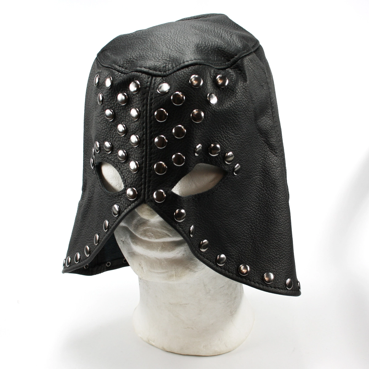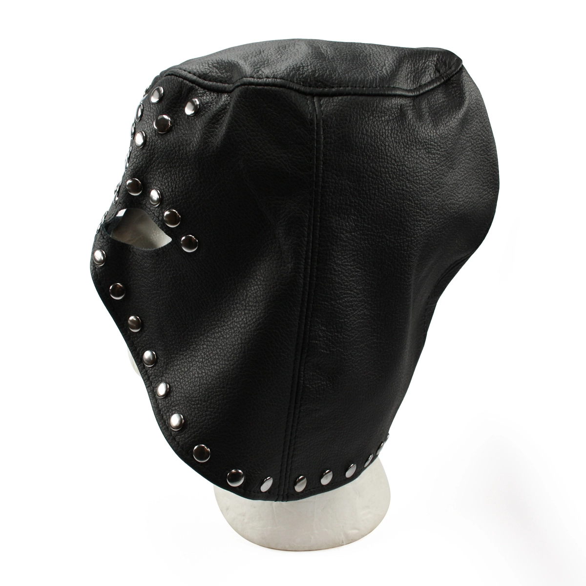 Zwart lederen masker, versierd met studs. Deze gevormde kap bedekt de bovenkant van het gezicht en loopt aan de achterkant tot de nek door. Geef jouw BDSM sessies wat extra pit met een extra rollenspel element!