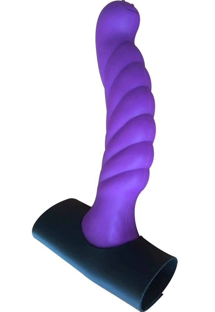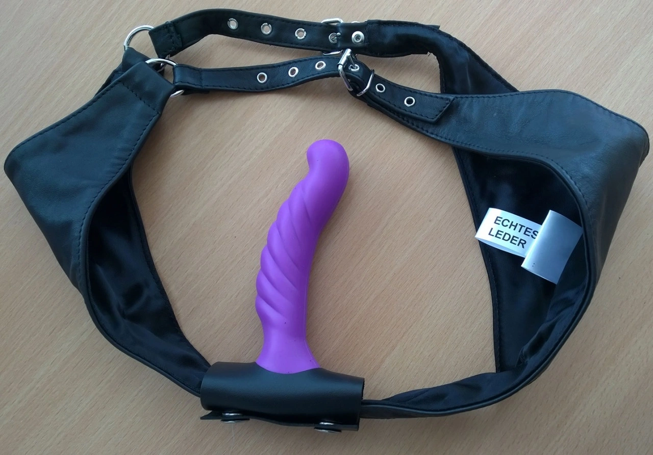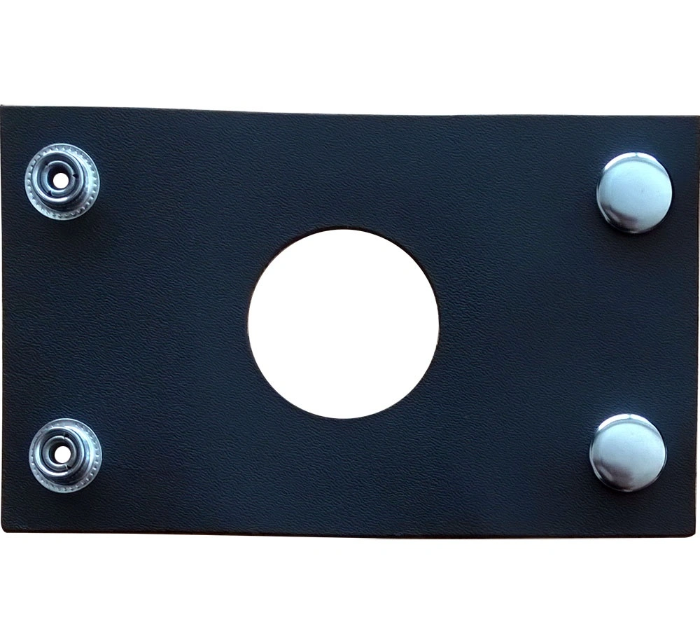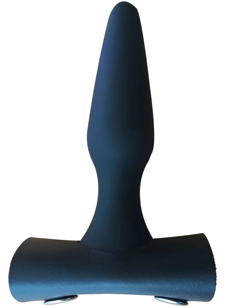 Zwarte echt lederen Dildo- of Buttplug-Adapter met 2 drukknoppen om de adapter snel en eenvoudig om een slip of string te klikken. Er kan een dildo of Buttplug in de adapter bevestigd worden.