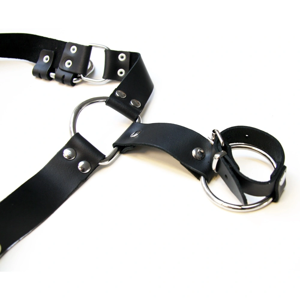 Brede lederen riem met geintegreerde O-ring en cockstrap. Stevige metalen D-ringen sieren beide zijden.