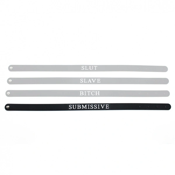 Verras uw onderdanige met deze hoge kwaliteit siliconen halsband. Deze comfortabele siliconen halsband is verstelbaar, om een goede pasvorm te garanderen. De halsband maakt de uiteindelijke verklaring, met het woord SUBMISSIVE op de voorkant in verhoogde witte siliconen letters. Verstelbare drukknopsluiting in de rug.