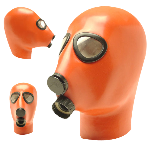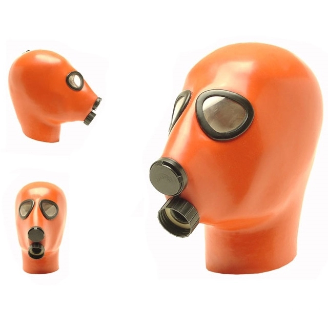 Studio Gum oranje, zwart of semi-transparante Latex Gas Mask Hood GMH2b met in-en uitlaat klep