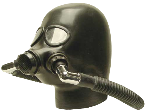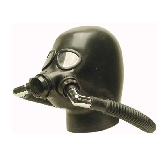 Studio Gum oranje, zwart of semi-transparante Latex Gas Mask Hood GMH2b met in-en uitlaat klep