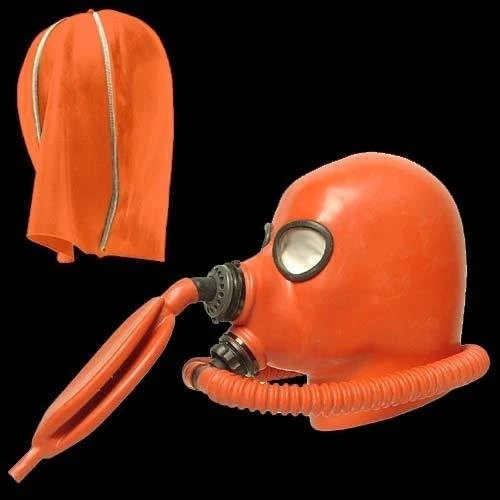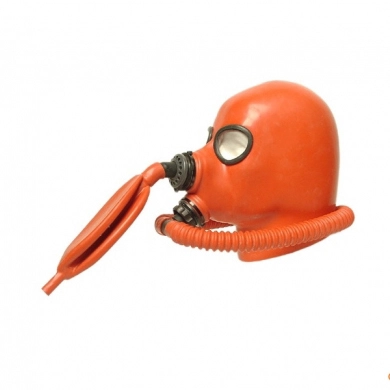 Studio Gum clini-red (oranje), zwart of semi-transparant Latex gasmasker GMH2b met in- en uitademventiel.