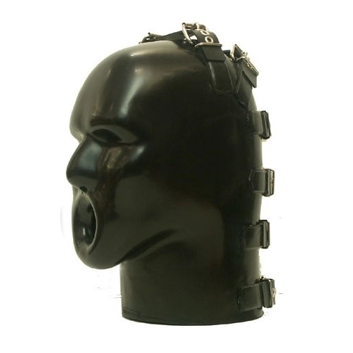 Heavy rubber latex helm met neusopening en ingebouwde gag. Met 4mm dikke latex beschermingsflap om te voorkomen dat uw haar tussen de riemen wordt gekneld.