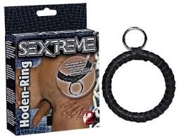 met zwart leder gehulde testikel ring (Ø 5 cm) met een oogje voor gemakkelijk bevestigen van kettingen en gewichten (gewicht/kettingen niet inbegrepen).