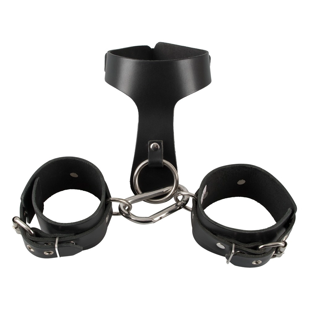 Authentieke bondage set geïnspireerd door “The story of O.”! Halsband met ring en twee niet gevoerde polsboeien aan een grote, simpele karabijnhaak. De polsboeien zijn verstelbaar.