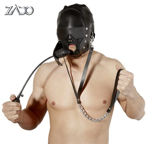 Met mondknevel! Zwart. Materiaal: split leer, latex.