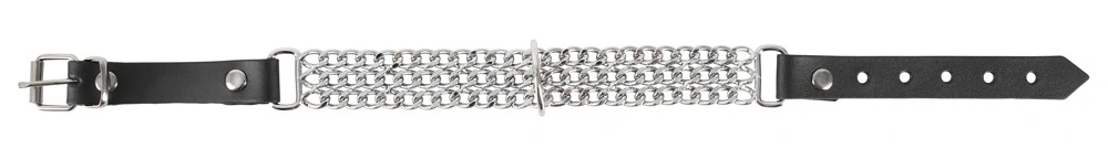Stijlvolle lederen ketting collar, welke gemaakt is van 3 gepolijste metalen kettingen met D-Ring aan de voorzijde. De collar is verstelbaar middels een echt lederen, rondaom afgestikte riem met gesp.